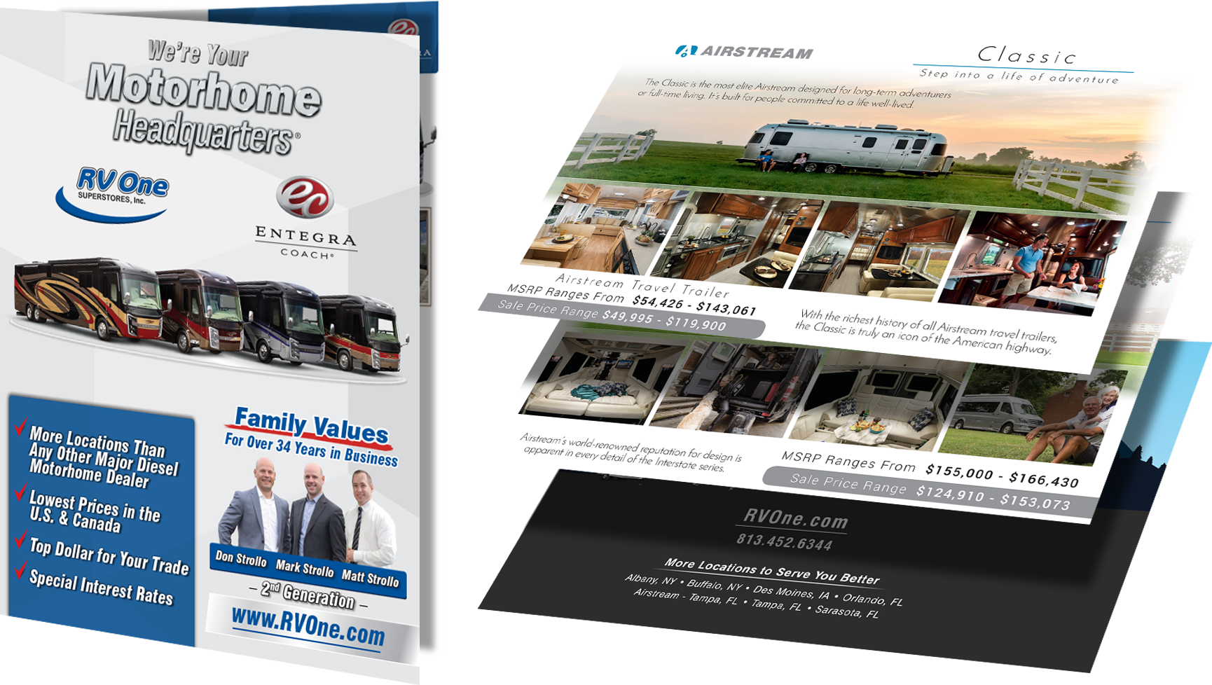 RV One Superstores fue una red de concesionarios de RVs que dominó el mercado del Este de los Estados Unidos. En mi rol de diseñador gráfico senior trabajé para incrementar nuestro alcance y efectividad de marketing, ayudando a expandir nuestra red de concesionarios de 5 a 10.